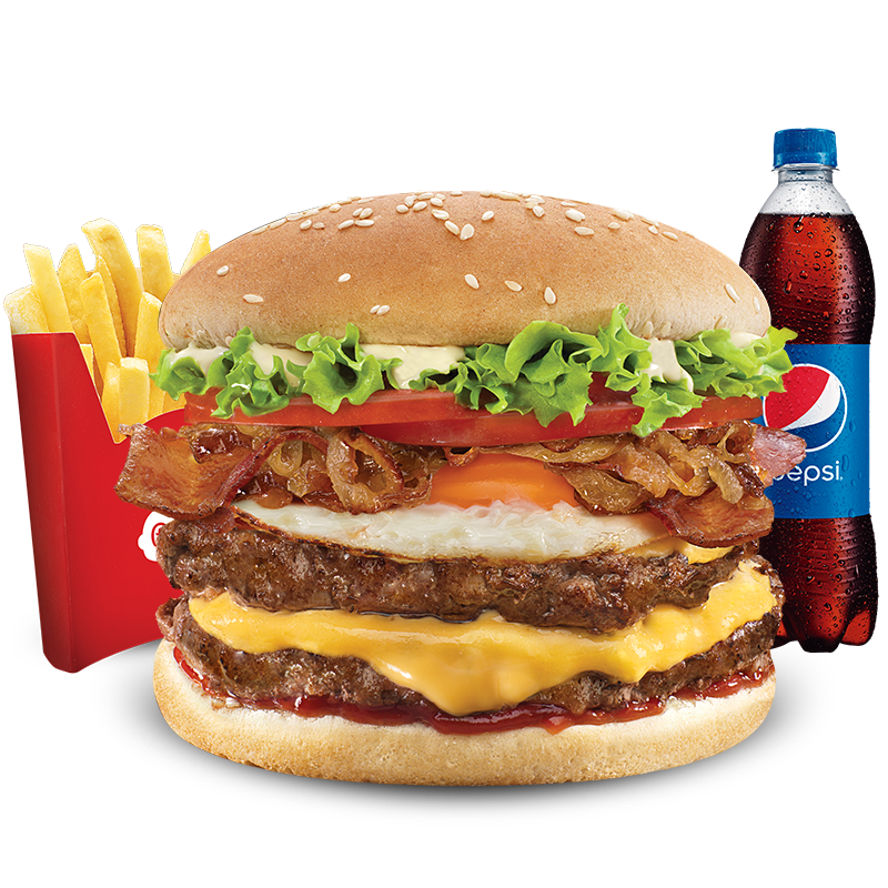 Hamburguesa Doble carne artesanal de 208 gr (104 gr cada carne), salsa de tomate, doble tajada cheddar, cebolla grillé, tomate, huevo frito y tocineta, papas mediana, 1 copa de salsa Presto y bebida 400 ml.