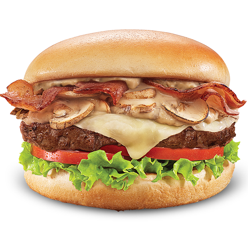 Hamburguesa con pan tipo brioche, carne artesanal de 104gr, queso mozzarella, salsa de champiñones, tocineta, lechuga y tomate.