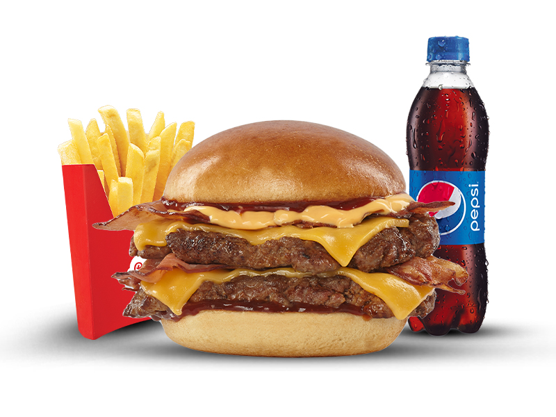 Doble carne artesanal de 104 g cada una con queso para asar derretido al punto perfecto, tres tiras de tocineta crujiente, cebolla grillé, tomate fresco y lechuga crocante, todo envuelto en nuestro pan artesanal y coronado con una deliciosa salsa BBQ dulce. incluye papas medianas doraditas y una gaseosa pet de 400 ml para completar la experiencia.