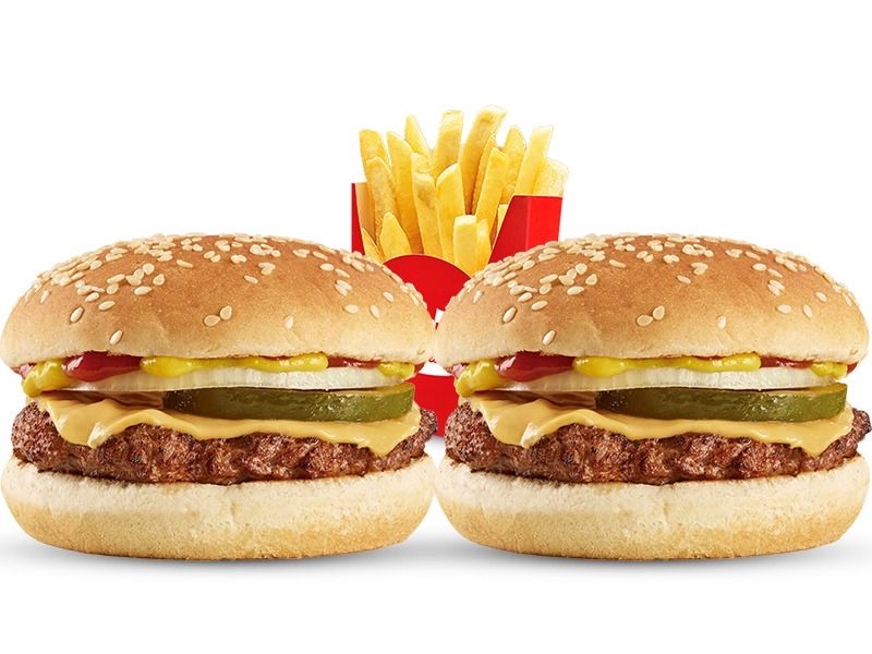 1 Hamburguesa Melacrispy y 1 Cheese Burger, acompañadas de 2 papas medianas y 2 bebidas