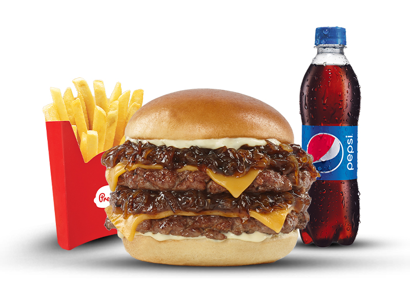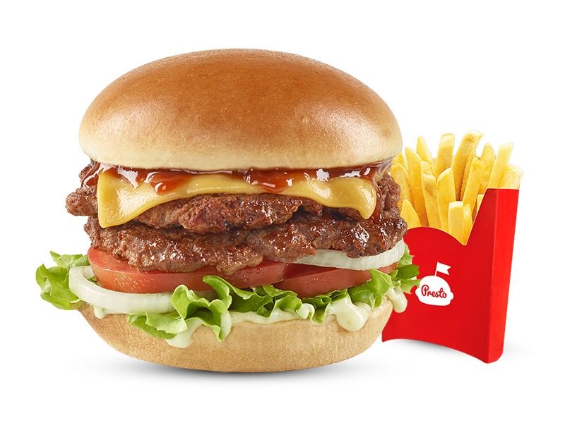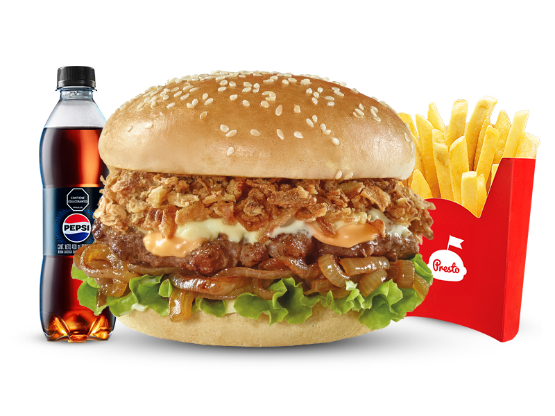 Hamburguesa con pan con ajonjolí, carne 100% res de 70gr, 6,5g de queso cheddar, con dos tipos de cebolla: caramelizada y crujiente, lechuga y la tradicional salsa Presto. Acompañada con papas pequeñas, una copa de salsa Presto y bebida de 400ml.