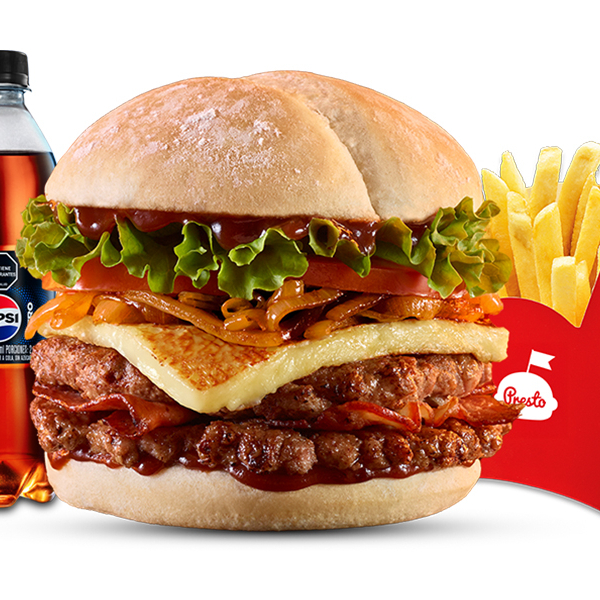 Hamburguesa doble carne de res de 208 gr (104 gr cada carne) con doble queso, cebolla, tomate, lechuga, salsa presto y de tomate, 1 papas medianas, 1 copa de salsa Presto y 1 gaseosa 400 ml.