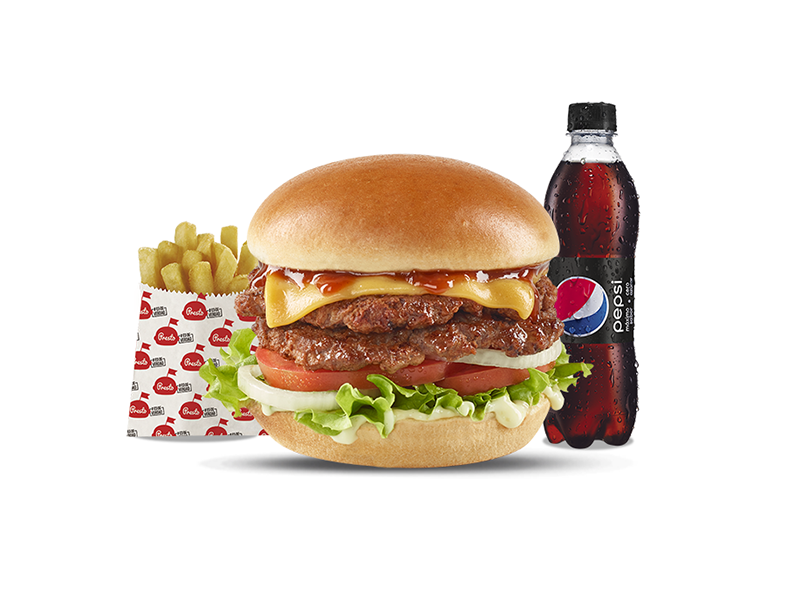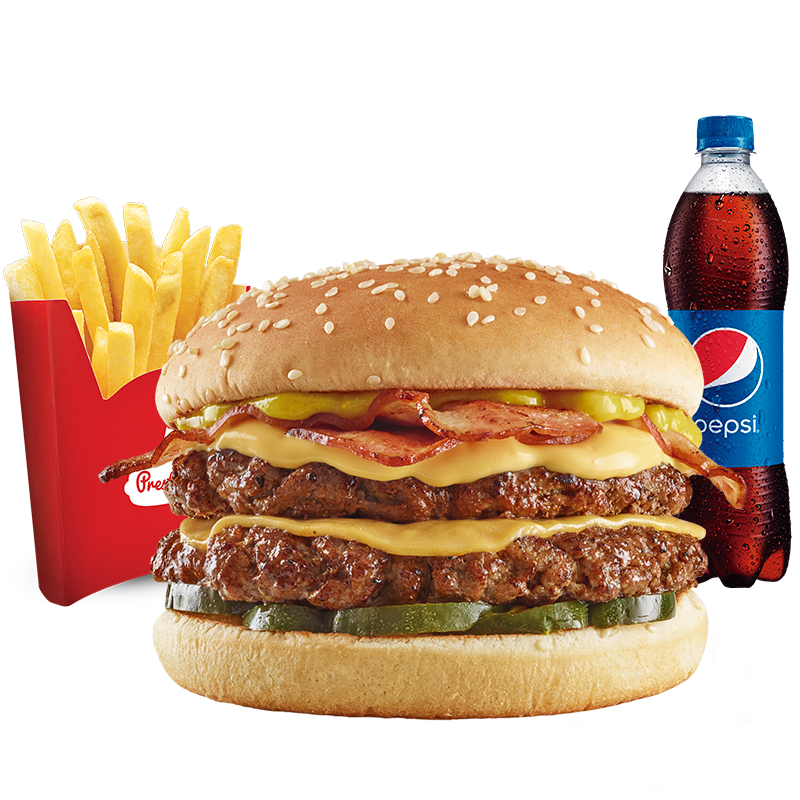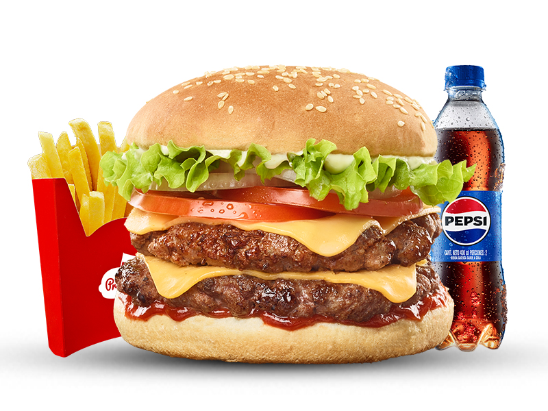 Hamburguesa doble carne de 208gr (104gr c/carne) con doble queso, cebolla, tomate, lechuga, salsa presto y de tomate, 1 papas medianas, 1 gaseosa 400 ml