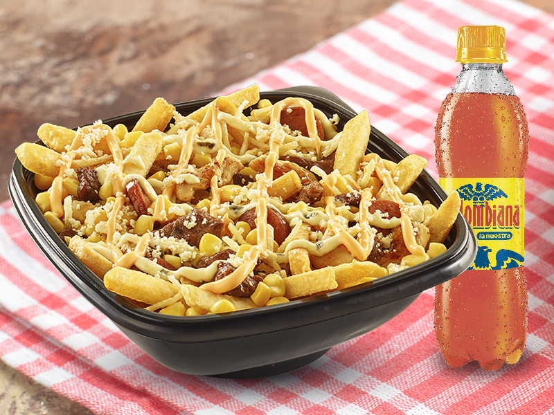 Mazorcada pechuga de pollo, lomo, salchicha, maíz desgranado, queso mozzarella, papa francesa y fósforo, aderezo cheddar, salsa presto, gaseosa 400 ml.
