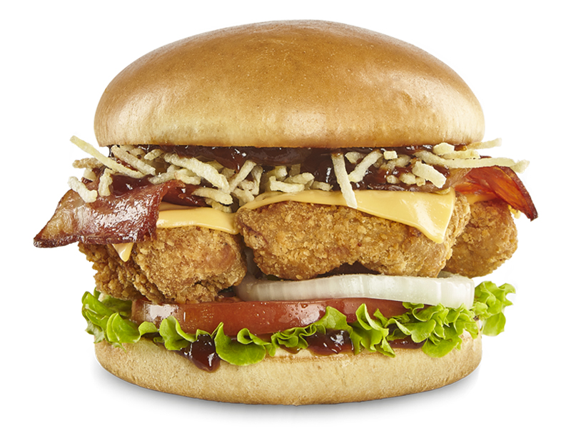 Hamburguesa de pollo crispy, en pan tipo brioche, con tajada de queso cheddar, tocineta, papas fosforito, salsa BBQ, lechuga, cebolla y tomate.