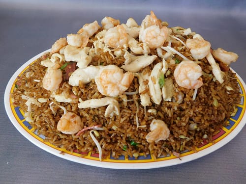 Arroz chino( 150 gramos aprox) con camarones ,pollo, cerdo y jamón ( 80 gramos por cada una )(presentancion pequeña )