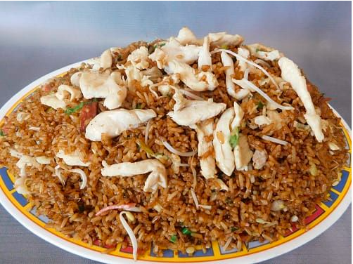 Arroz especial revuelto con pollo, jamón, cebolla y raíces chinas