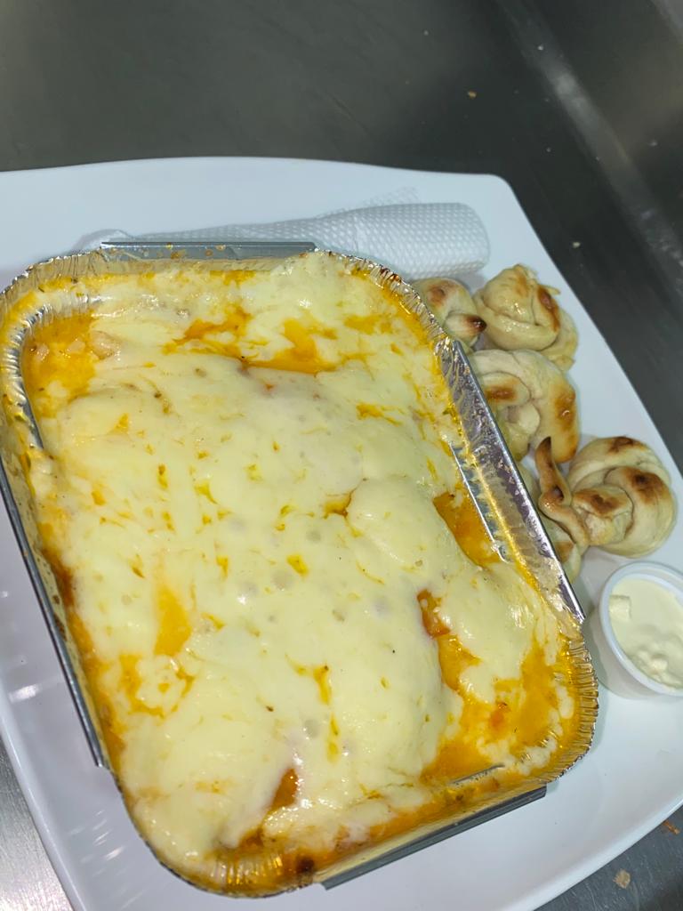 Pastas, Salsa bechamel, Queso crema, Acompañado de pan al ajillo, Pollo y Carne