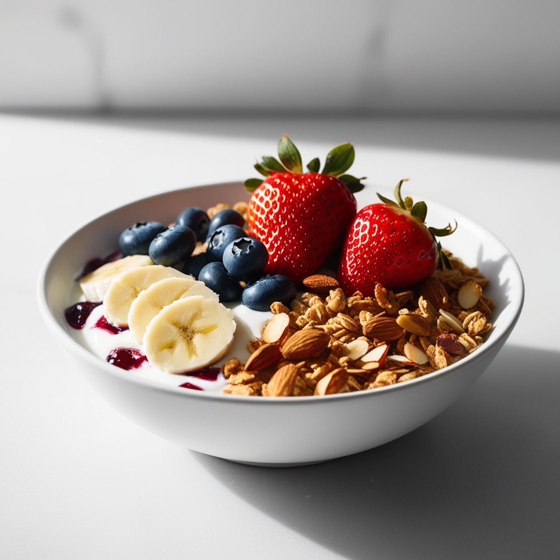 Acaí, banano, fresa, arándanos, granola y almendras.