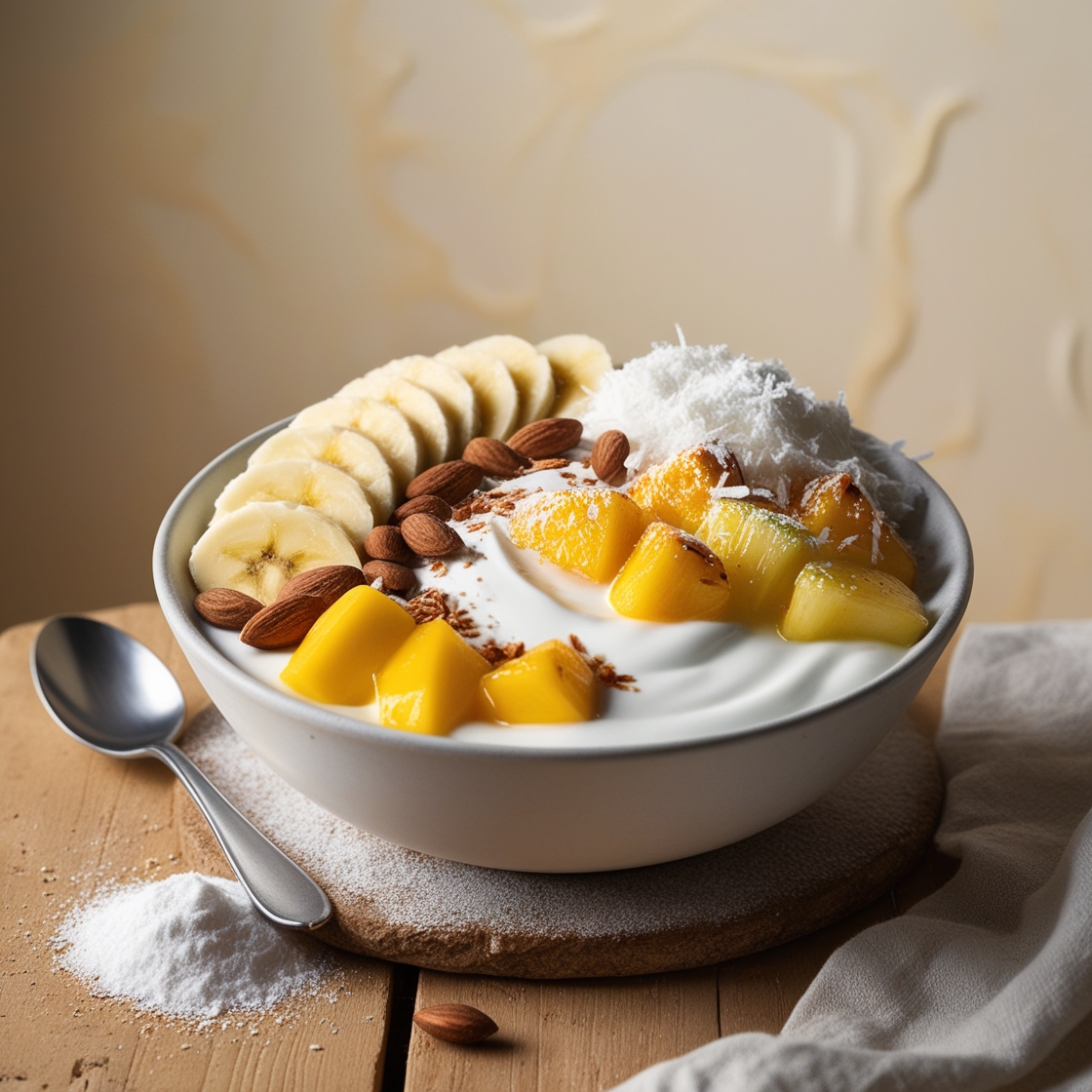 Acaí, banano, almendras, mango, piña, coco deshidratado y leche en polvo.