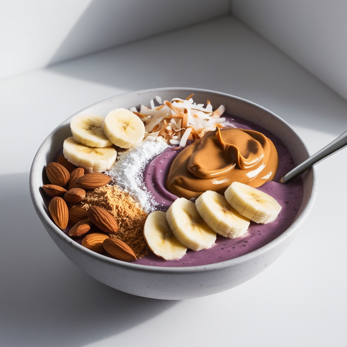 Acaí, banano, leche en polvo, mantequilla de maní, almendras, coco deshidratado y Milo.