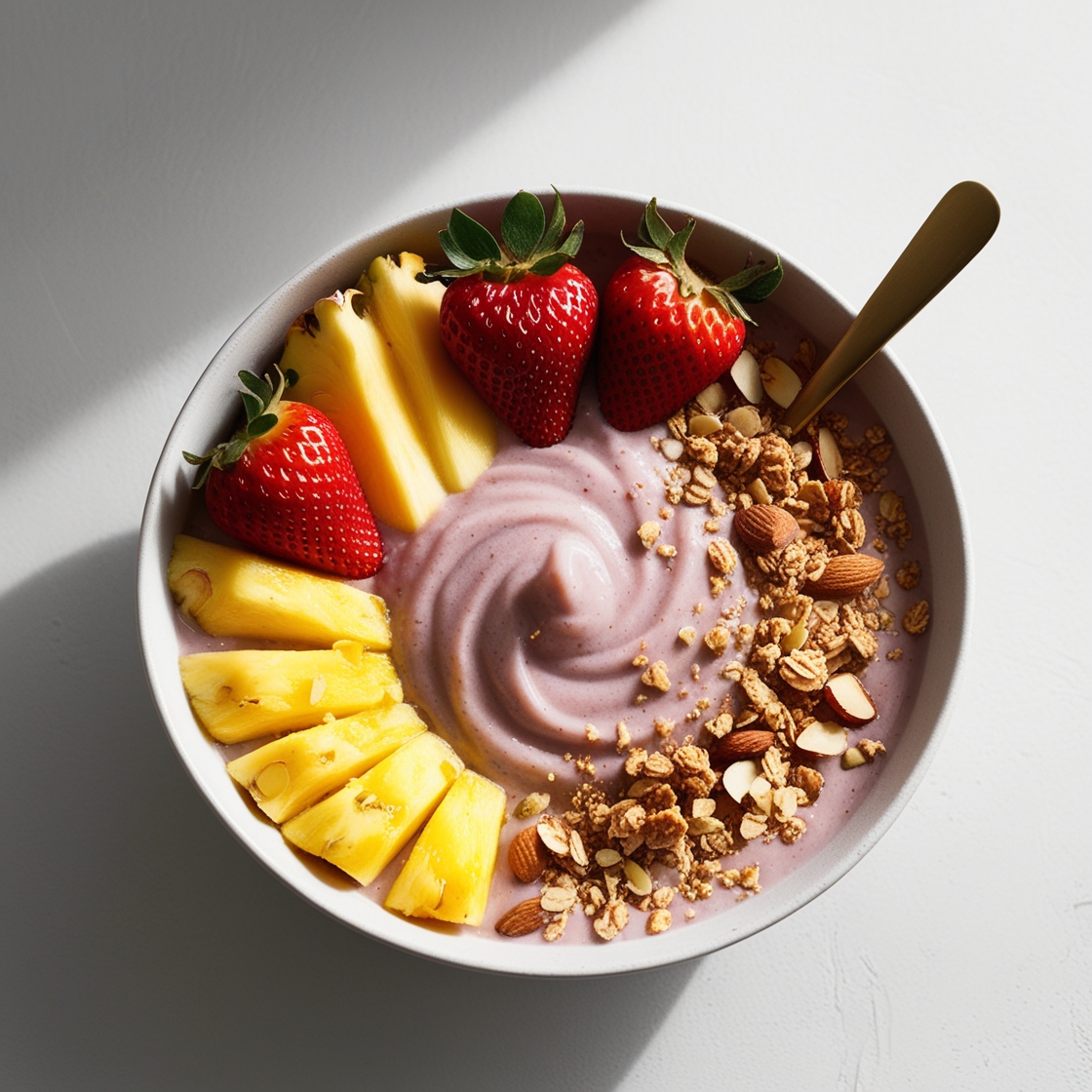 Acaí, fresa, granola, piña, mango y almendras.