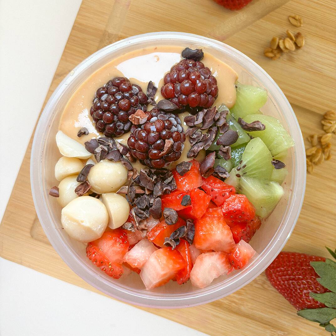 Base de acaí, acompañada de mantequilla de maní, banano, kiwi , nibs de cacao, fresas, macadamia y zarzamora.