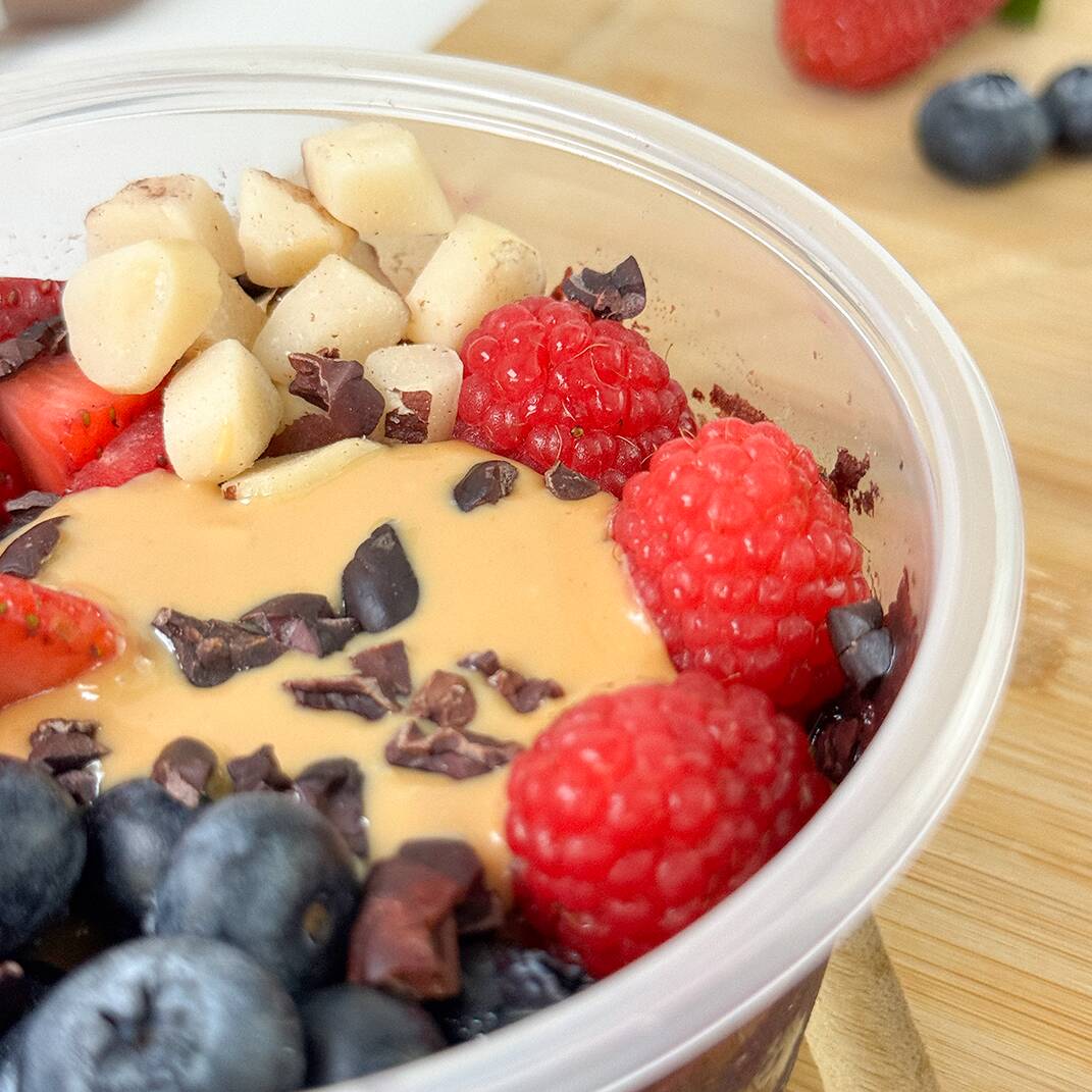2 sunberry con base de acaí, acompañada de fresas, arándanos, rodajas de banano, granola crujiente, mantequilla de maní y un toque de semillas de chía.