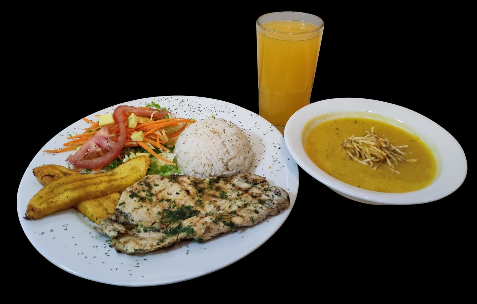 Delicioso almuerzo casero con Arroz, proteína y guarnición a elección, ensalada y jugo del día. Opcional de arepa. La sopa del día es adicional.