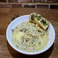 Deliciosa salsa blanca con pollo, tocineta y champiñones.