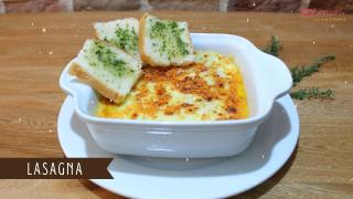 Delicioso plato Italiano de capas de pastas intercaladas con ingredientes y salsa que realzan el sabor, acompañado de pan.