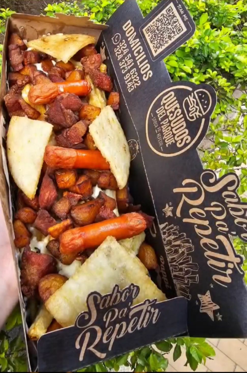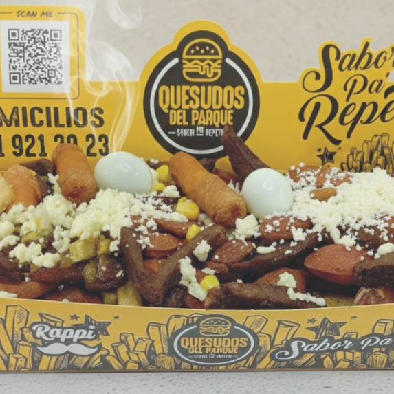 Papas, chicharron, chorizo, queso, arepa, madurito