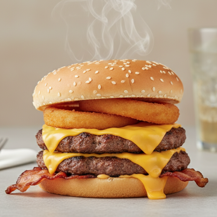 Pan Brioche, doble carne artesanal, doble queso cheddar, doble aros de cebolla y tocineta