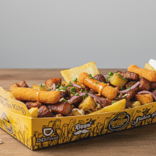 800 gramos papa natural, pollo desmechada y carne desmechada, pico de gallo y guacamole. para 1 o 2 persona