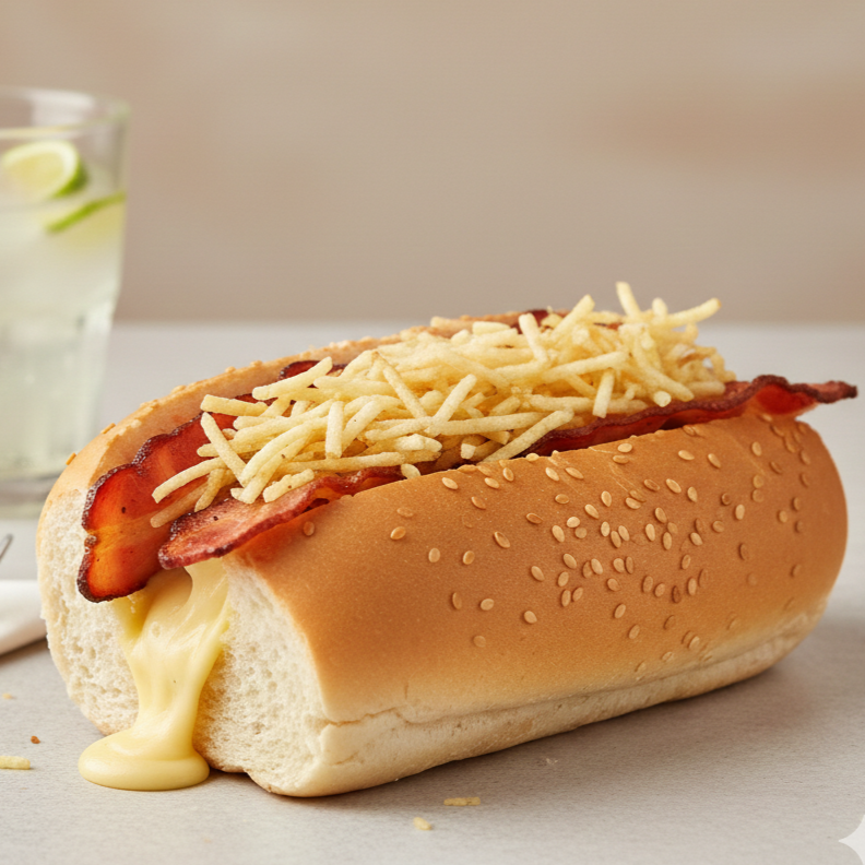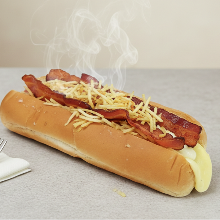 Pan Artesanal, queso , Salchicha Zenú, tocineta, ensalada de la casa y papa triturada.