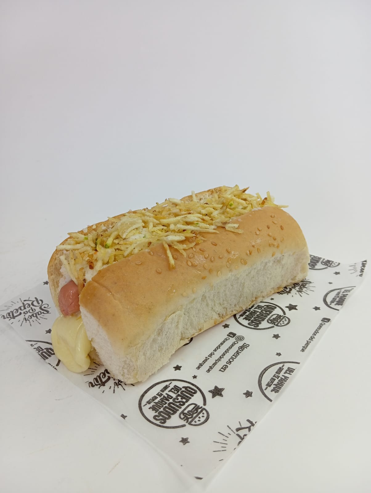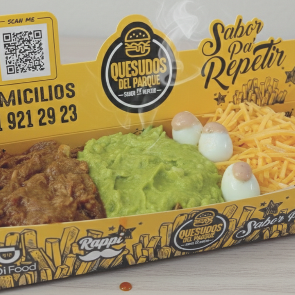 Pan perro, queso, cebolla caramelizada, lechuga, tomate, papa triturada, carne artesanal, filete de pollo y salchicha Zenú