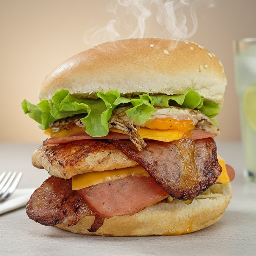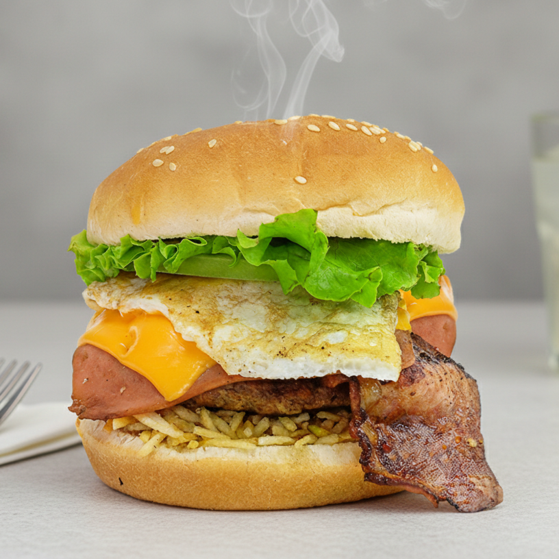 Deliciosa Hamburguesa Artesanal con Pan Bimbo artesanal, carne de res y filete de pollo, doble tocineta, doble jamónm y doble queso, huevo, lechuga, tomate, papa triturada.