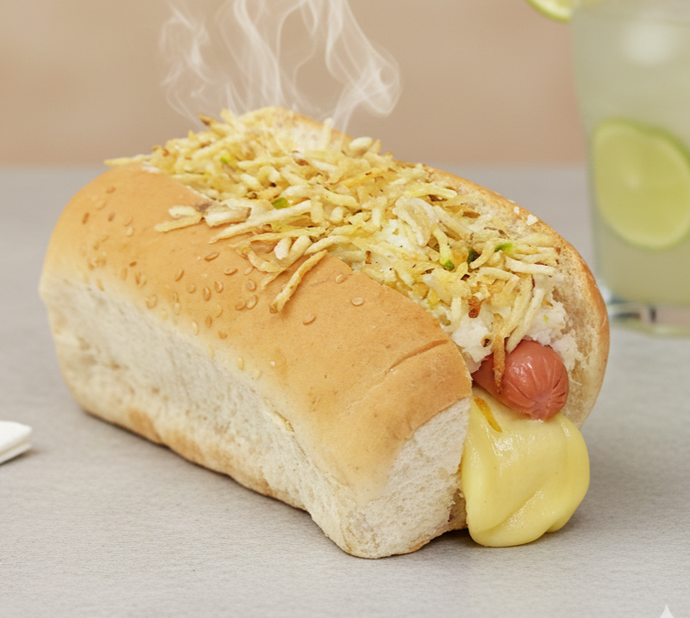 Delicioso perro Pan Artesanal, queso, Salchicha Zenú, ensalada de la casa y papa triturada.