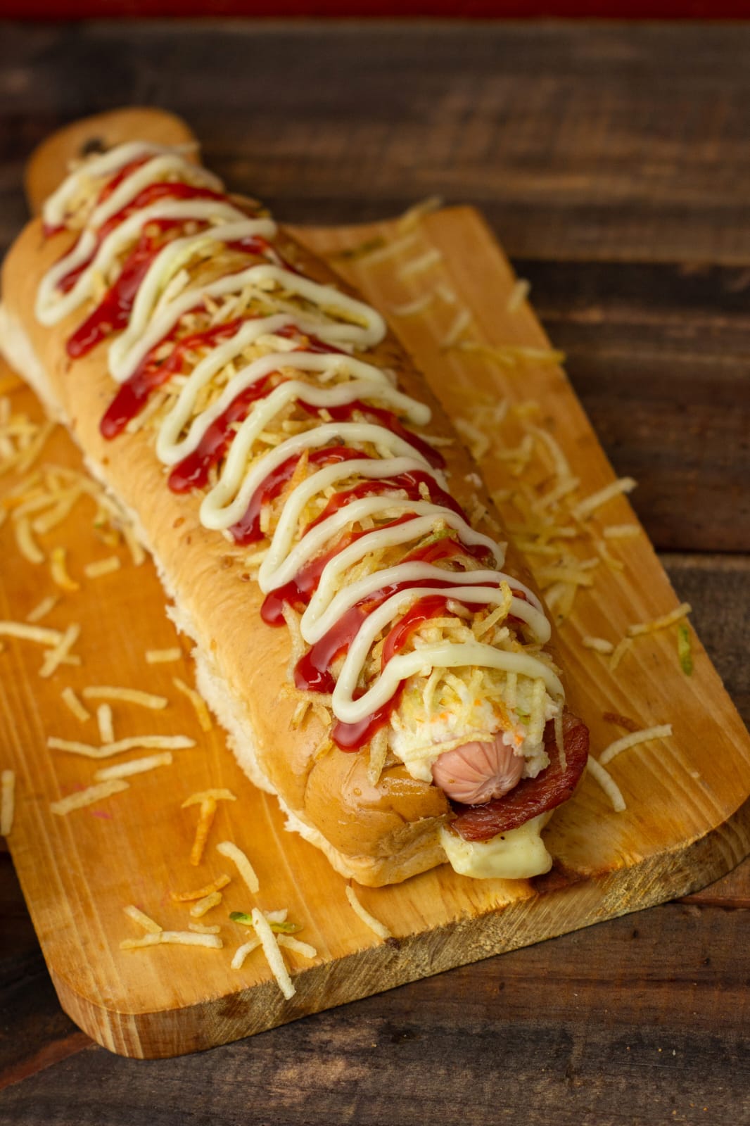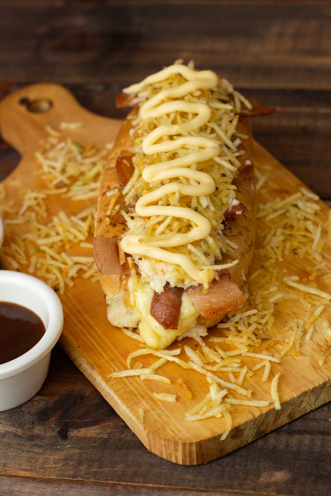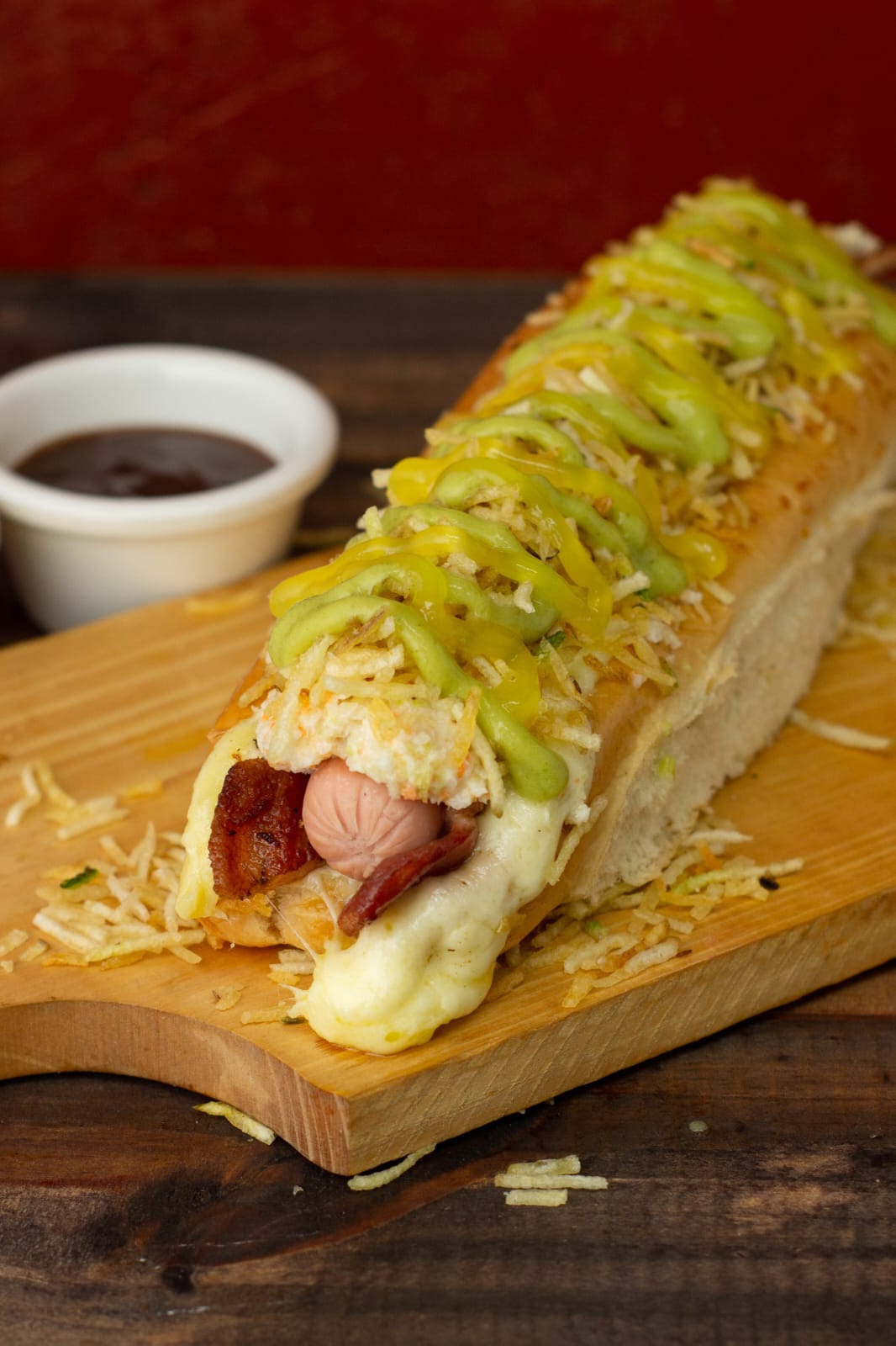 Pan grande, salchicha grande, queso fundido, tocineta picada, ensalada, ripio de papa.