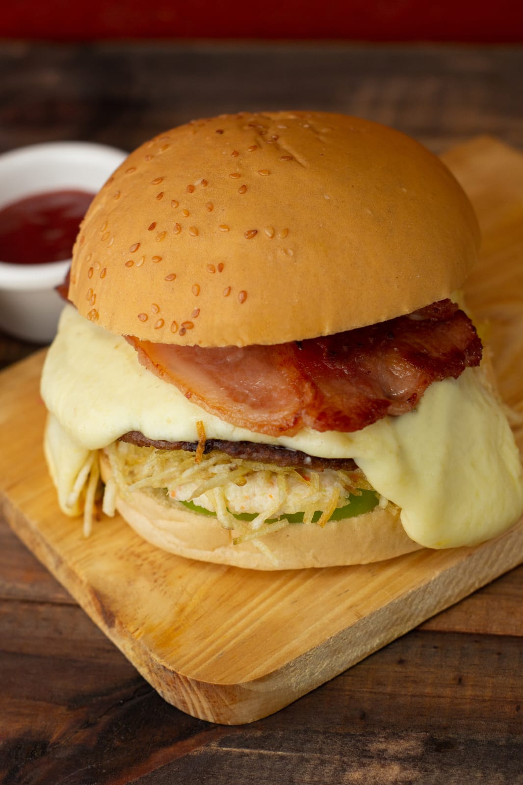 Pan doradito, carne 95 g, queso fundido, tocineta picada, tomate, ensalada, ripio de papa.