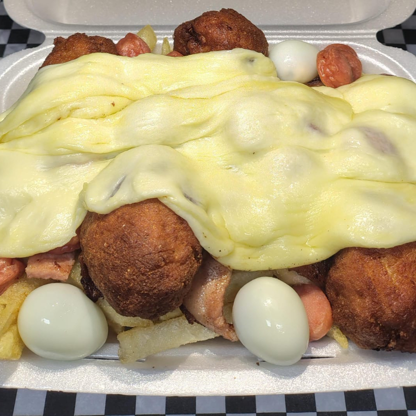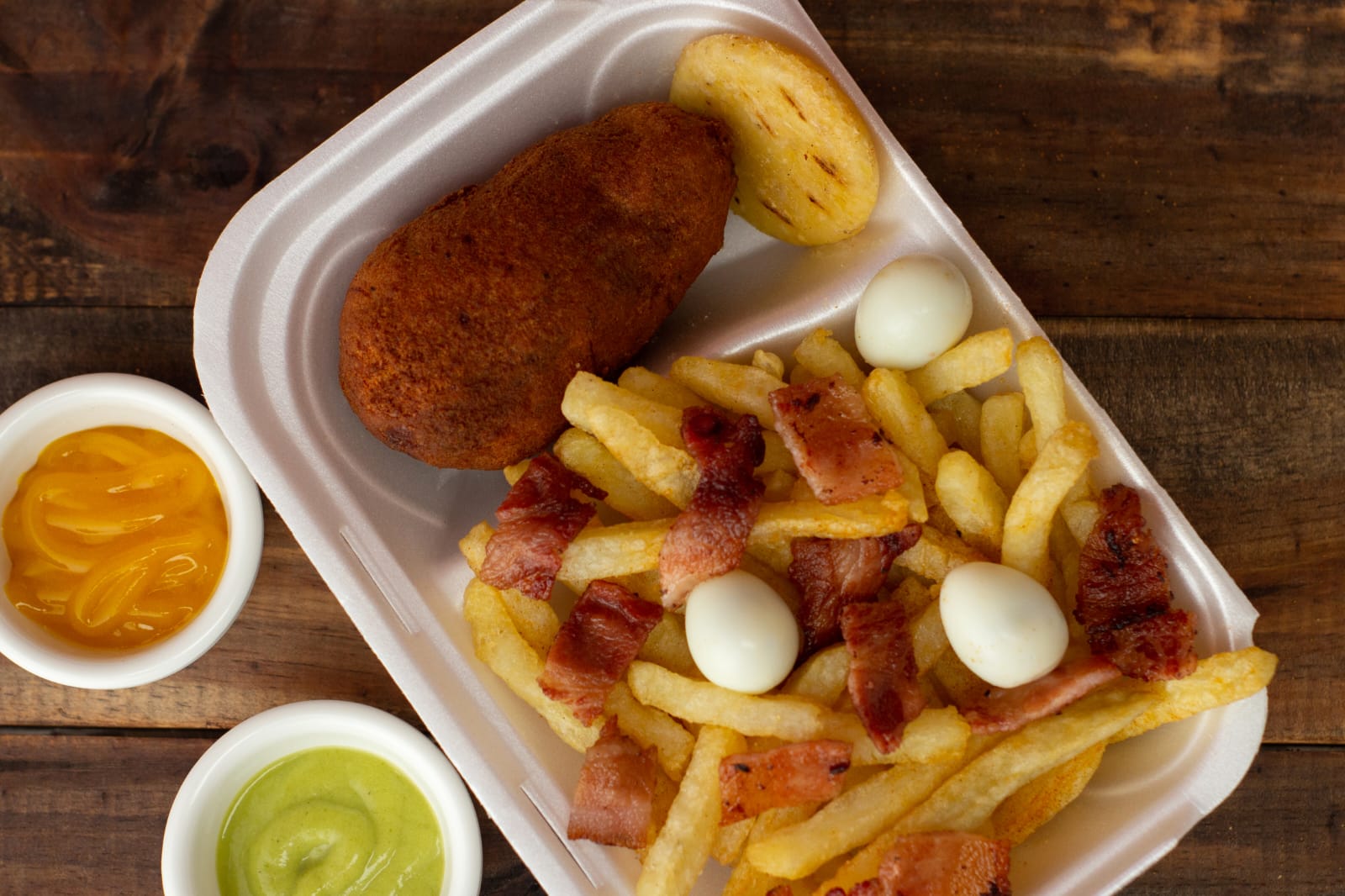Papas a la francesa, 4 mini bombones de pollo, tocineta y salchicha picadas, 2 arepas fritas, 2 butifarras, 4 huevos de codorniz y queso mozarella fundido