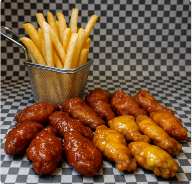 12 alitas apanadas + 2 porciones de papas a la francesa y salsas a elegir