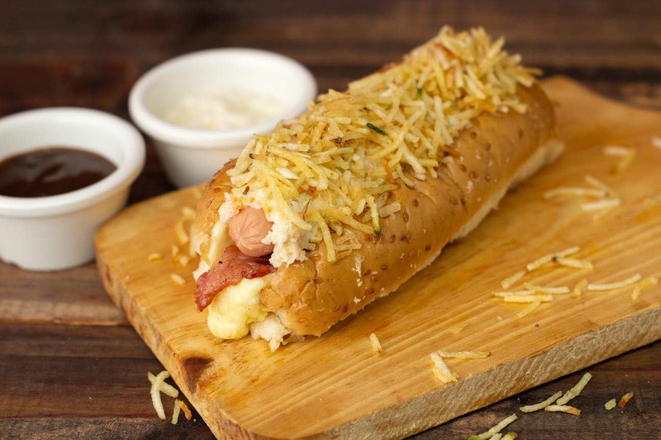 Pan grande, salchicha americana, queso fundido, tocineta picada, ensalada, ripio de papa.