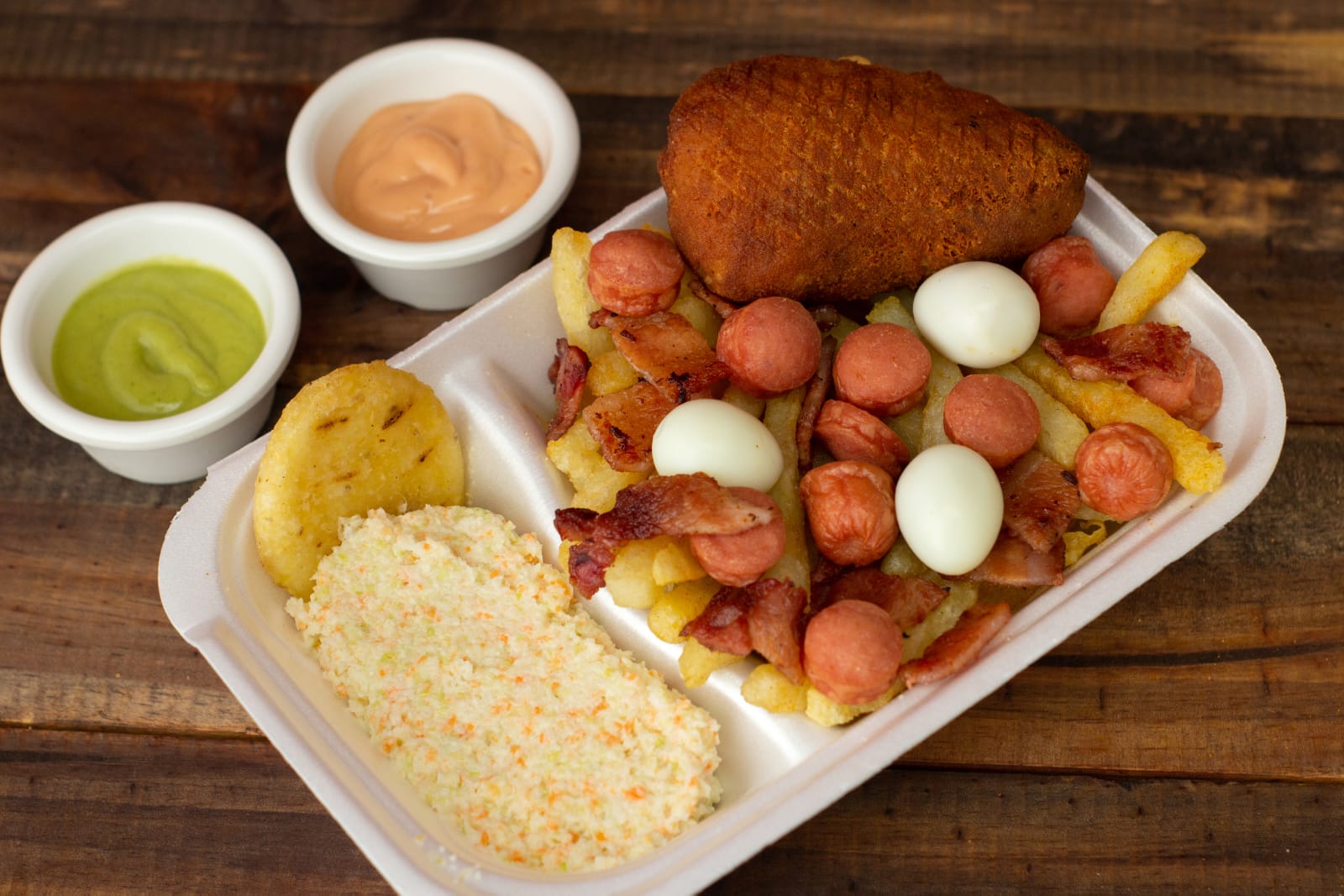Bombón de pollo 180 g, papas, tocineta picada, salchichas, 3 huevos de codorniz, ensalada, arepa frita.
