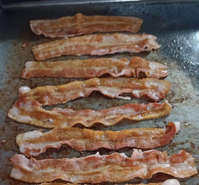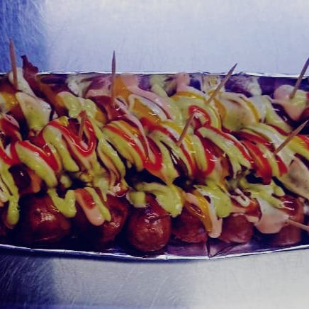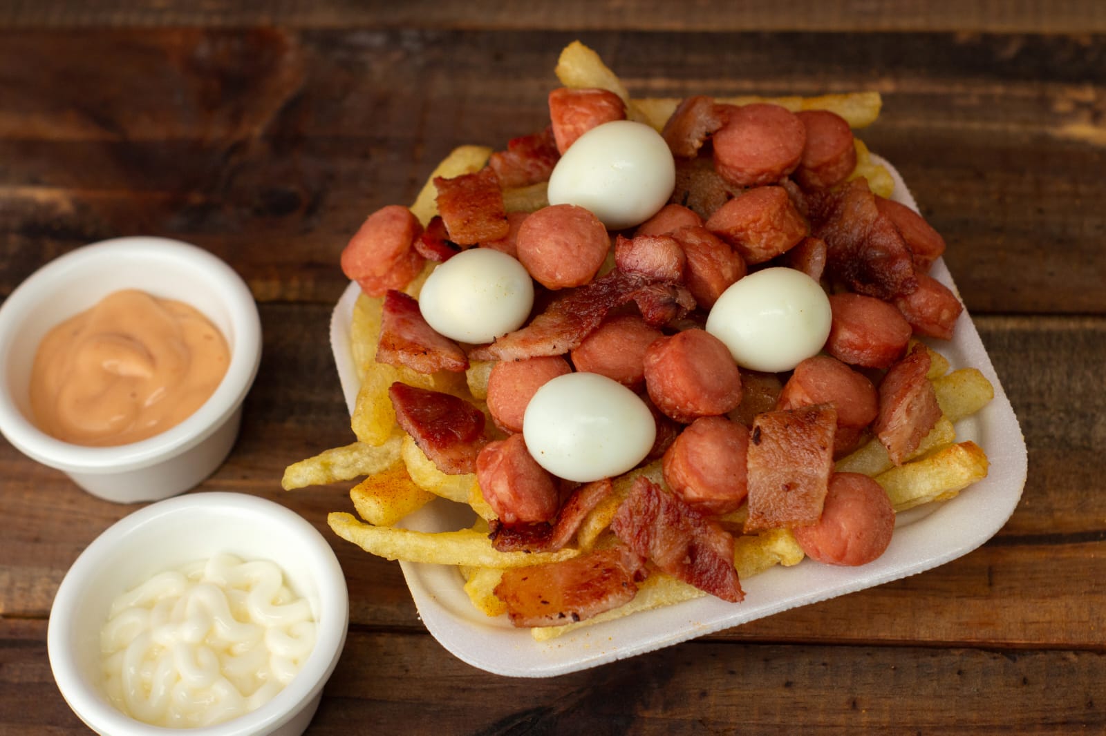 Papas, salchichas, 4 huevos de codorniz, tocineta picada.