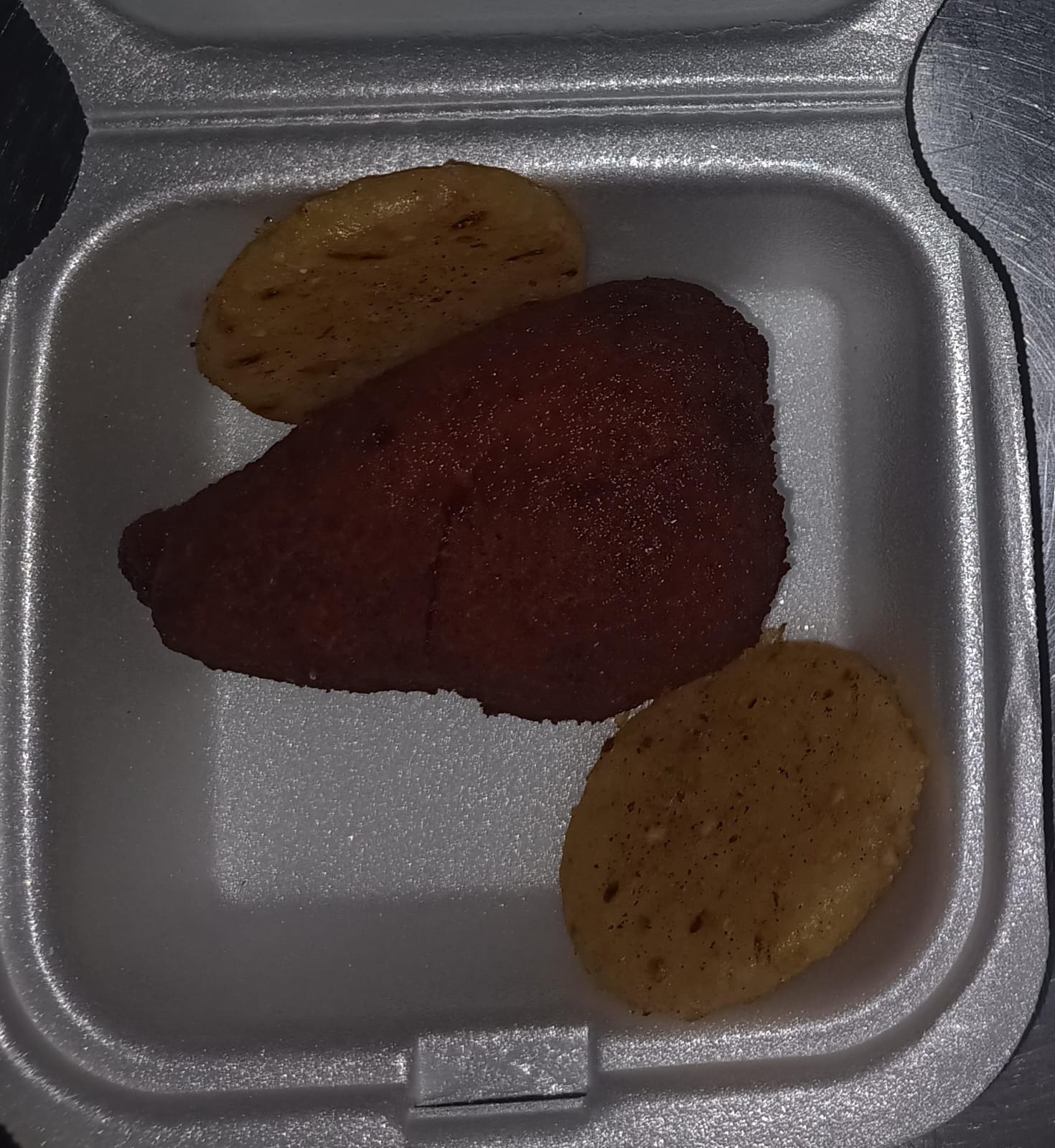 Bombón de pollo 180 g, papas, tocineta picada, 3 huevos de codorniz, arepa frita.