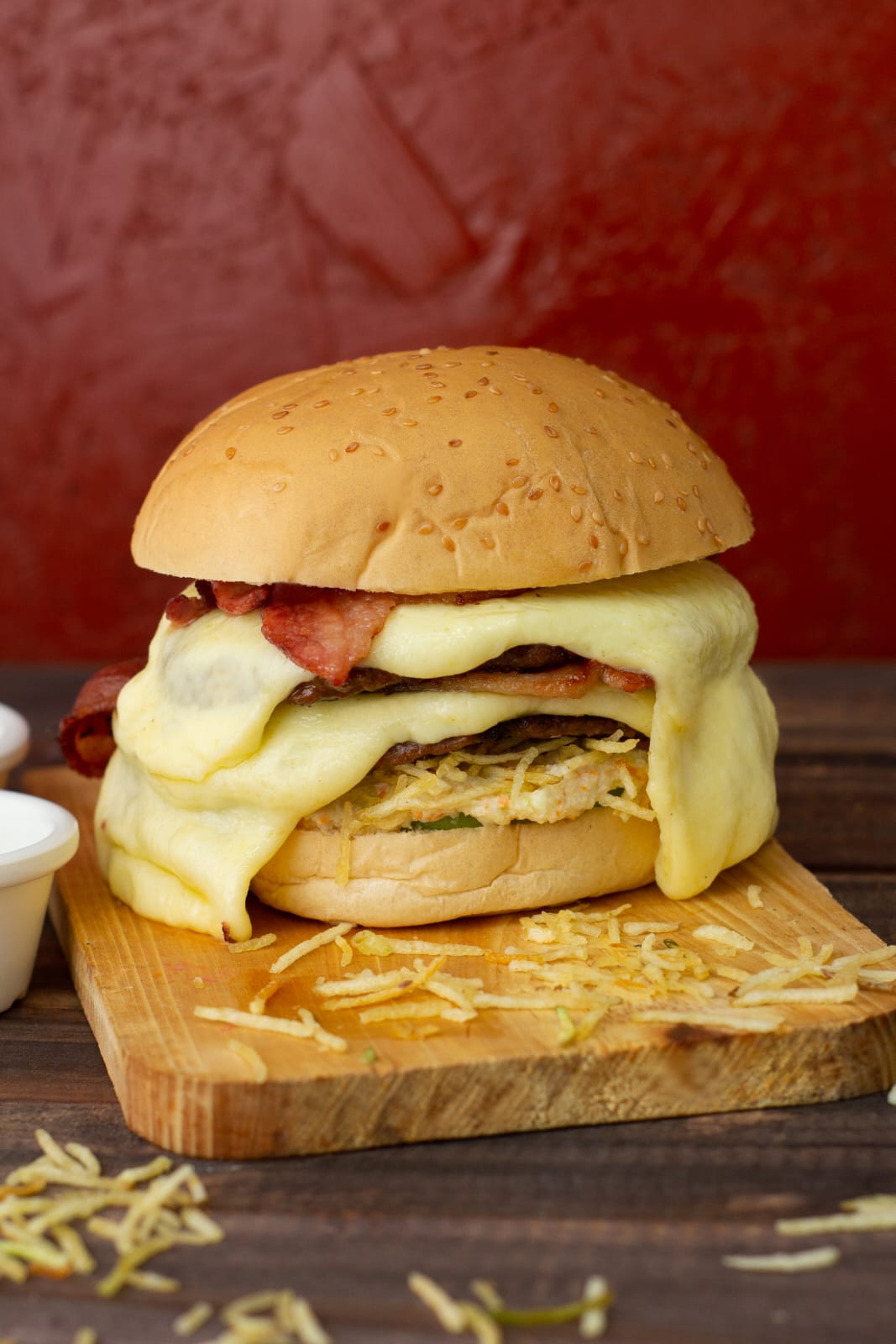 Pan doradito, doble carne 95 g, doble queso fundido, doble tocineta picada, tomate, ensalada, ripio de papa.