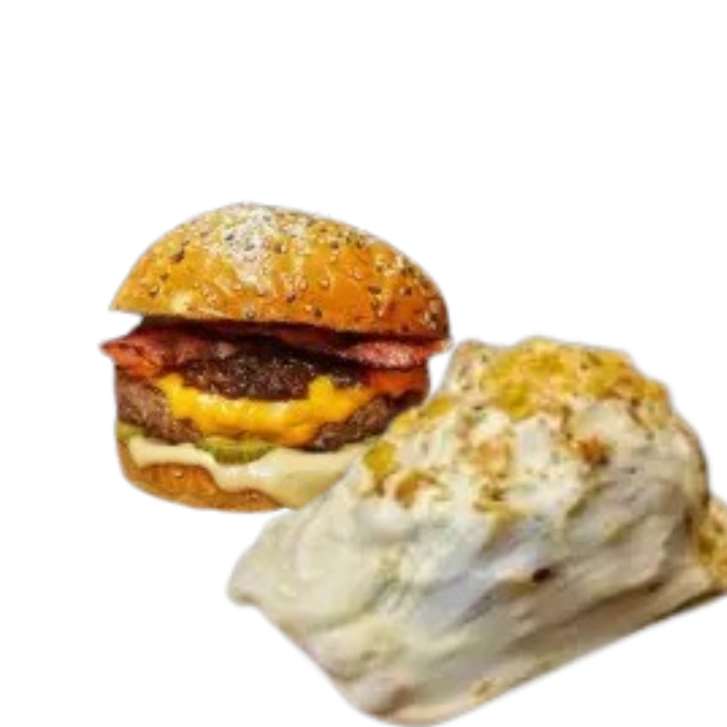 Pan Bimbo, dos carnes artesanales 100 g, queso fundido, tocineta, tomate, ensalada de la casa y ripio de papa.