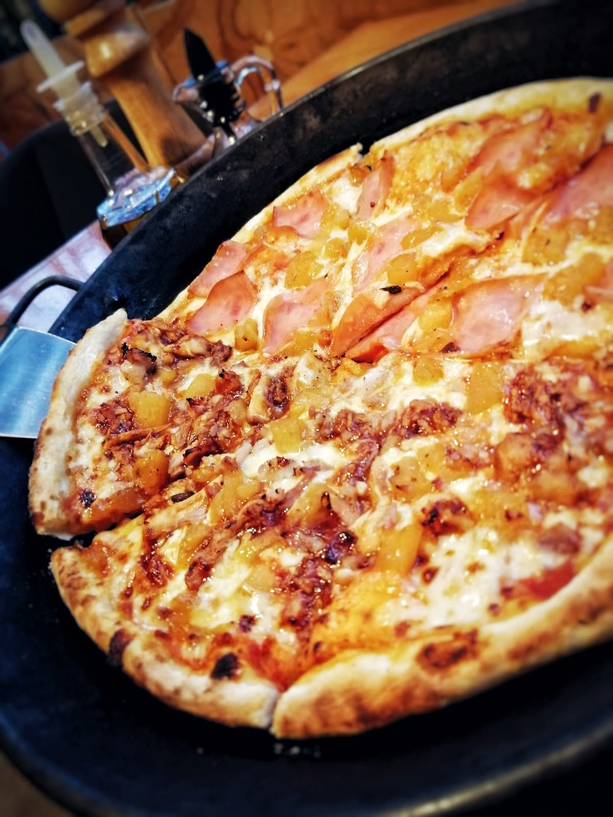 Masa, pasta de tomate, queso mozzarella, pollo desmechado bañado en salsa BBQ, hecha en casa con trozos de tocineta y piña colada.