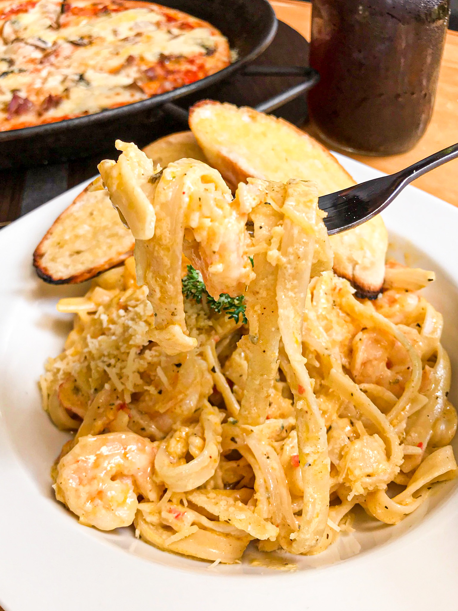 Pasta corta en salsa napolitana, trozos de lomo de cerdo artesanal, gratinada en pequeños toques de salsa blanca, queso mozzarella y parmesano, acompañada de pan con mantequilla de ajo.