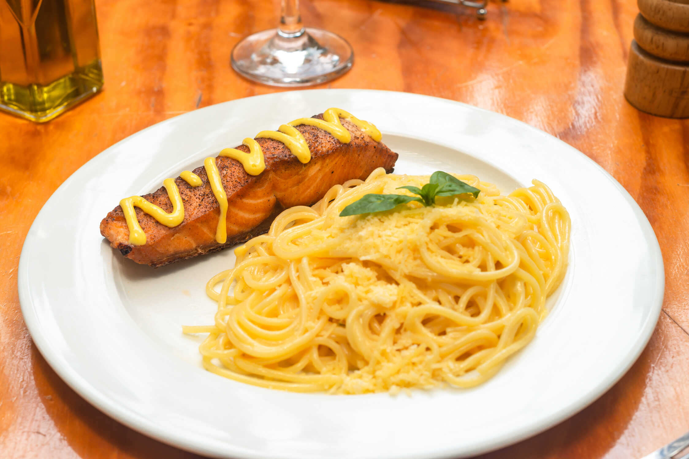Filete de salmón bañado en salsa holandesa, acompañado de pasta en salsa Alfredo, con tomates cherry y queso parmesano.