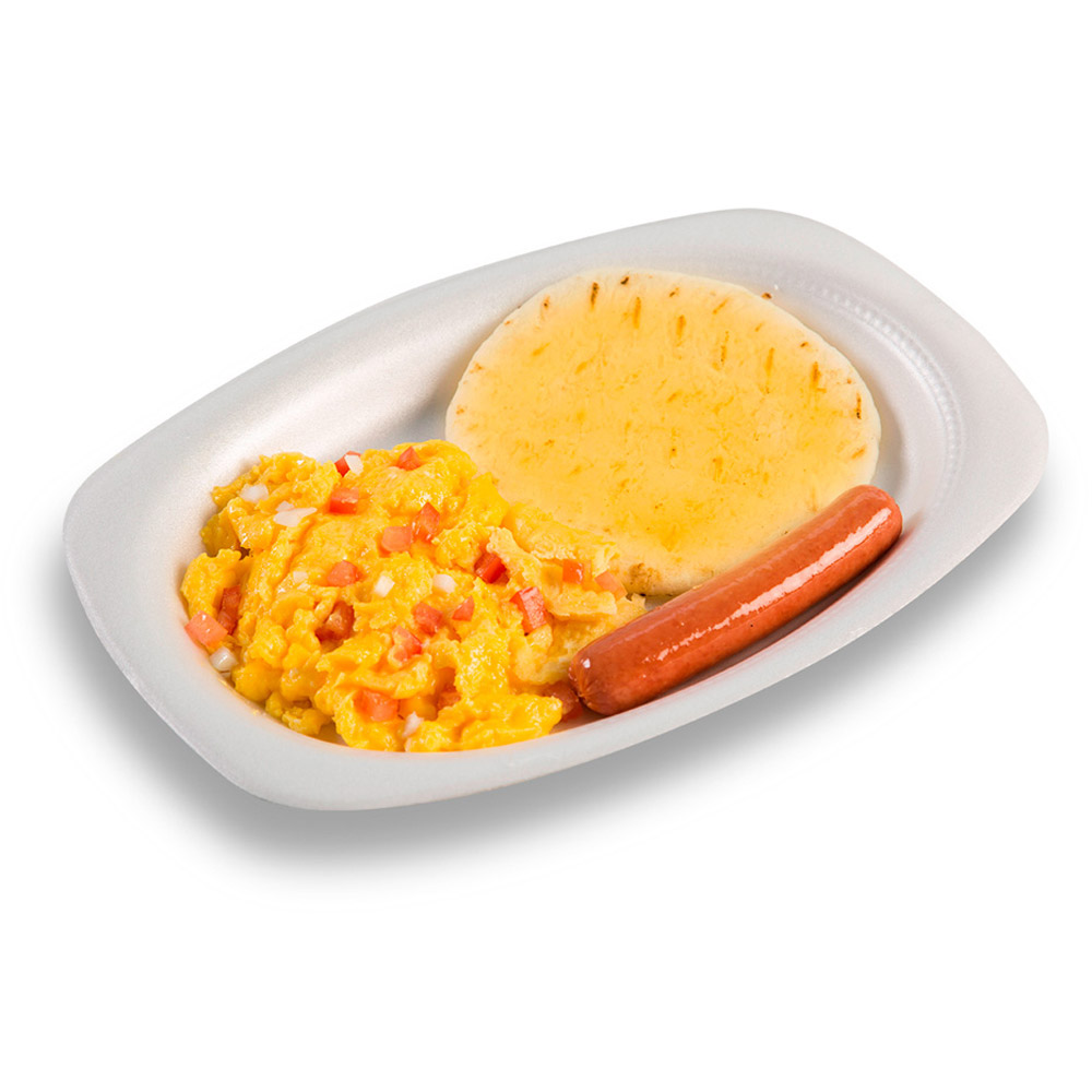 Desayuno, huevos revueltos con tomate, cebolla, arepa y salchicha tipo Ranchera.