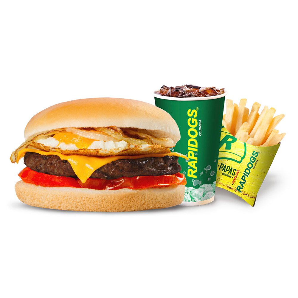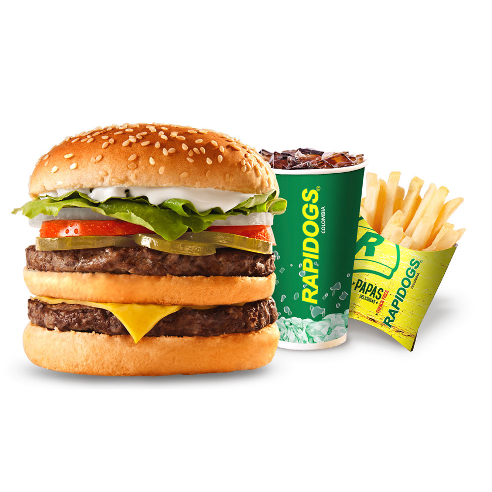 Hamburguesa doble, tres panes, queso americano, verduras, salsas, gaseosa y acompañamiento a elección.