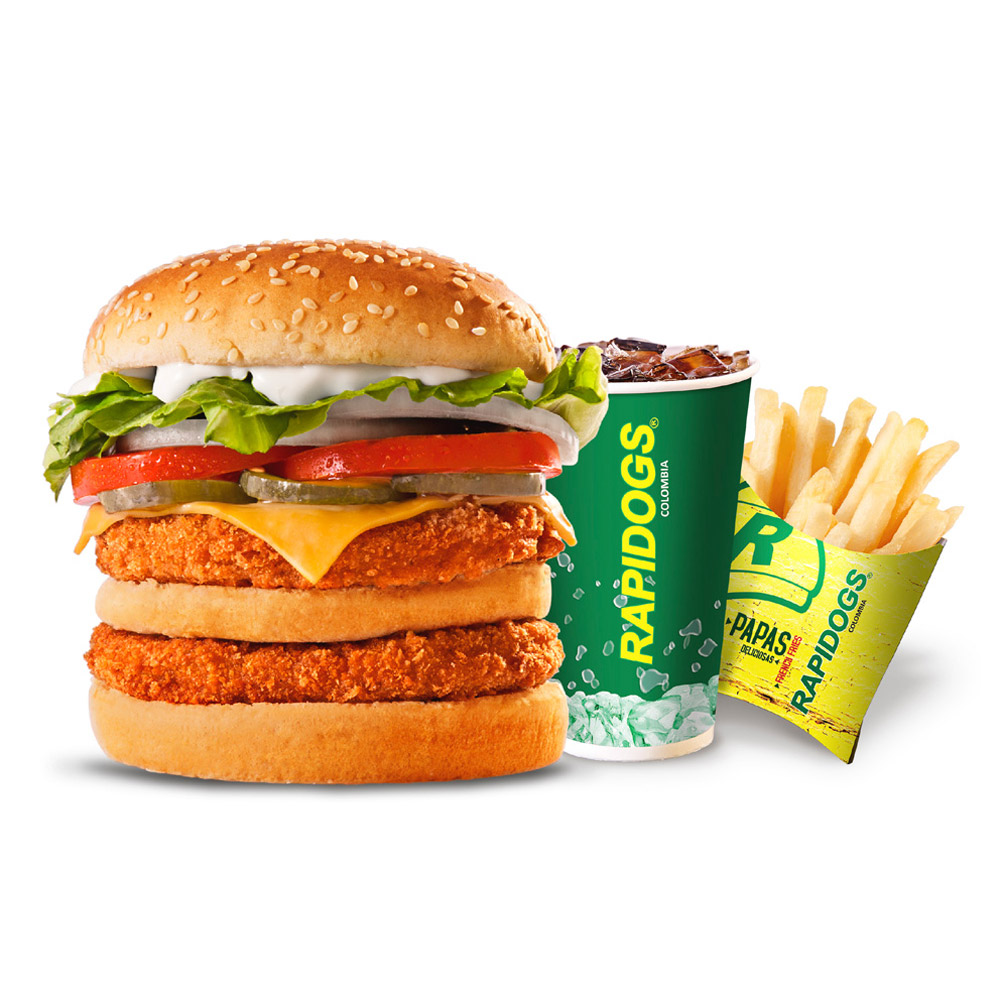 Hamburguesa doble de pollo, tres panes, queso americano, verduras, salsas, gaseosa y acompañamiento a elección.
