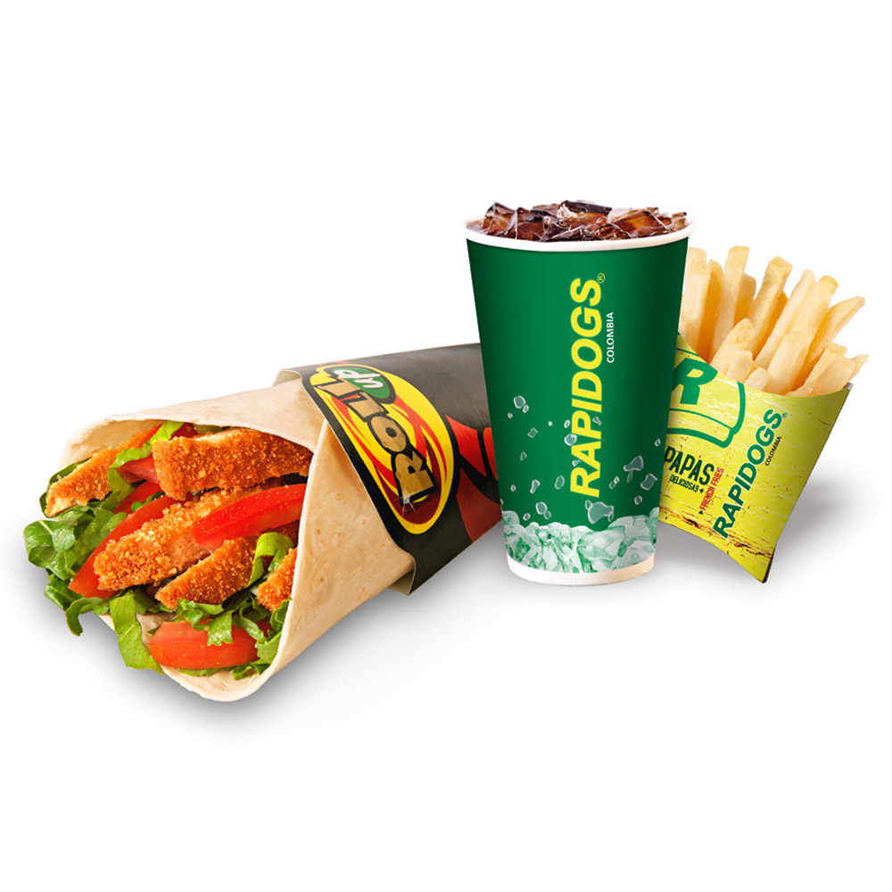 Wrap de tortilla de harina con proteína a elección, verduras, salsa rapidogs y pimienta, acompañado de papas y gaseosa a elección.