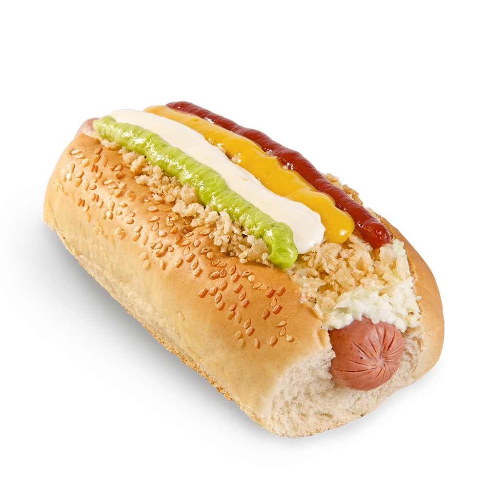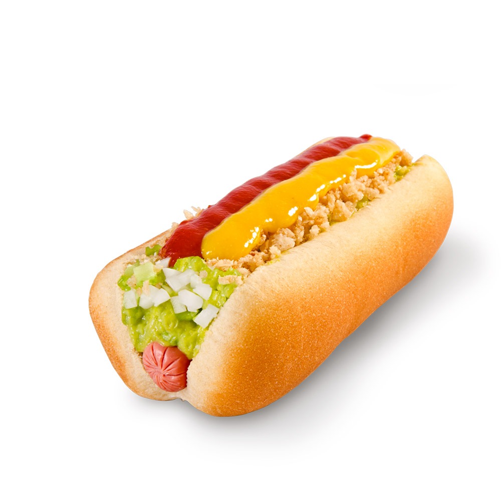 Perro caliente de 12 cm con guacamole, cebolla, ripio de papa, mostaza y salsa de tomate.