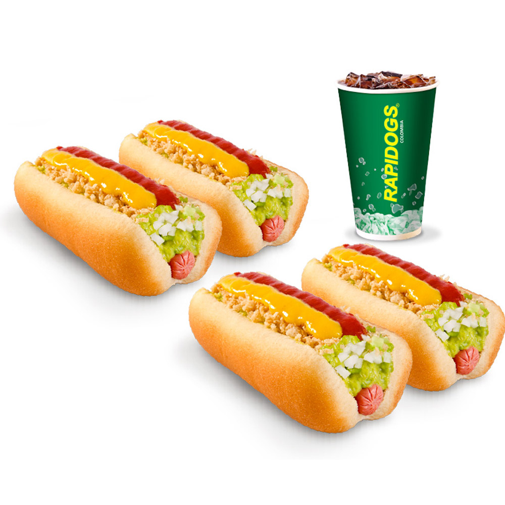 Perros calientes silver (12 cms) x 4 más bebida a elección (guacamole, cebolla, ripio de papa y salsas).