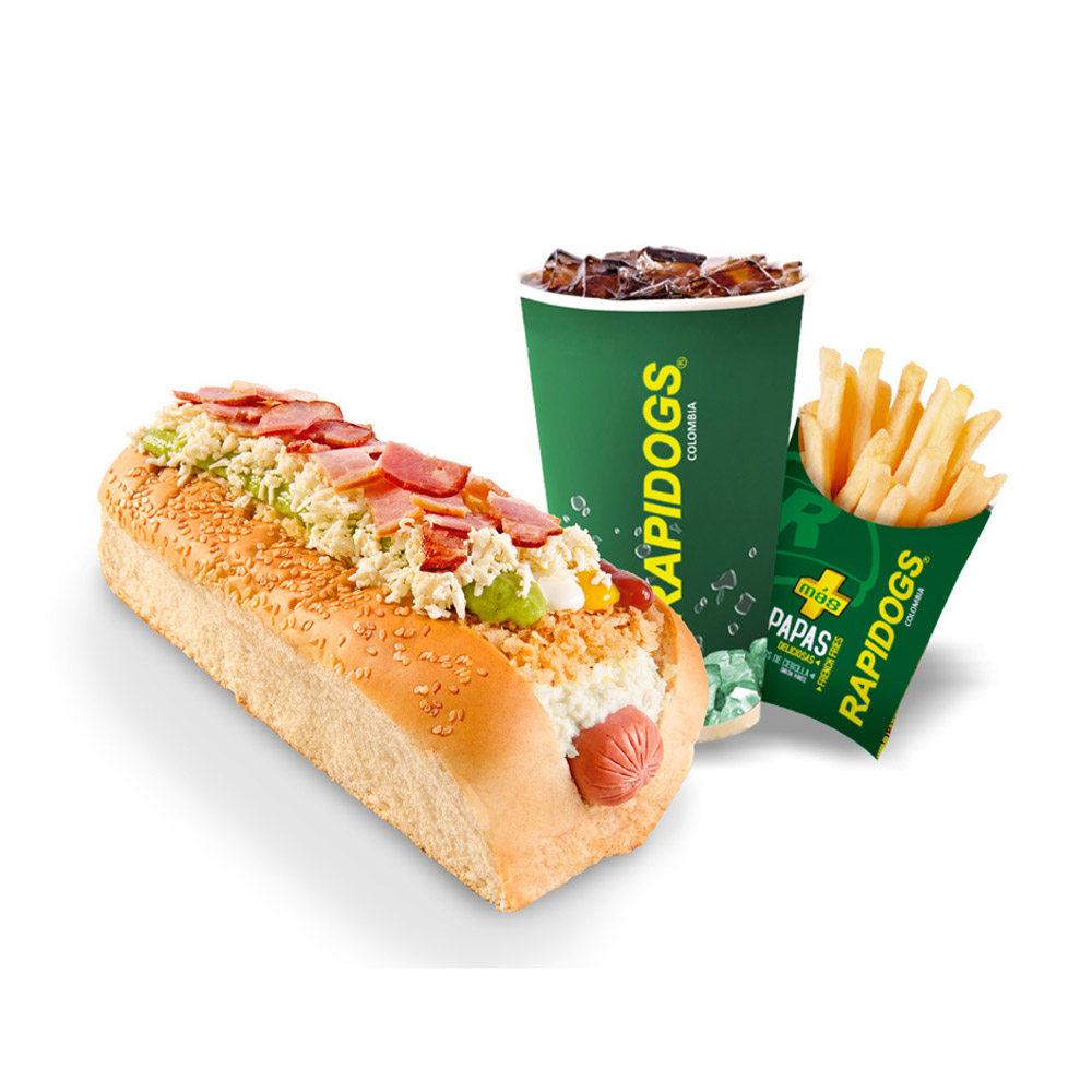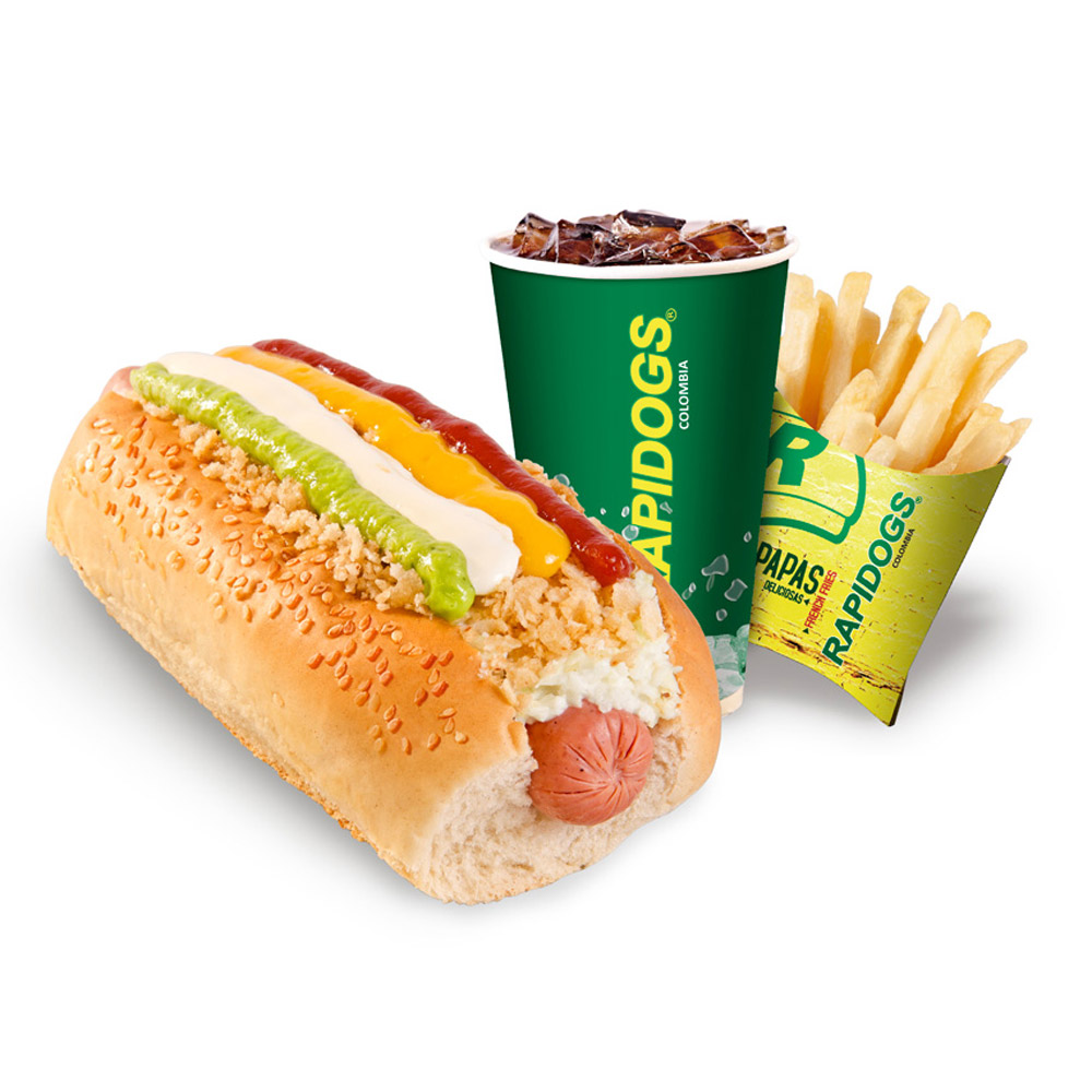 Perro caliente clásico de 17 cm con ensalada de repollo, ripio de papa y salsas, acompañado de papas y bebida a elección. (hot dog).