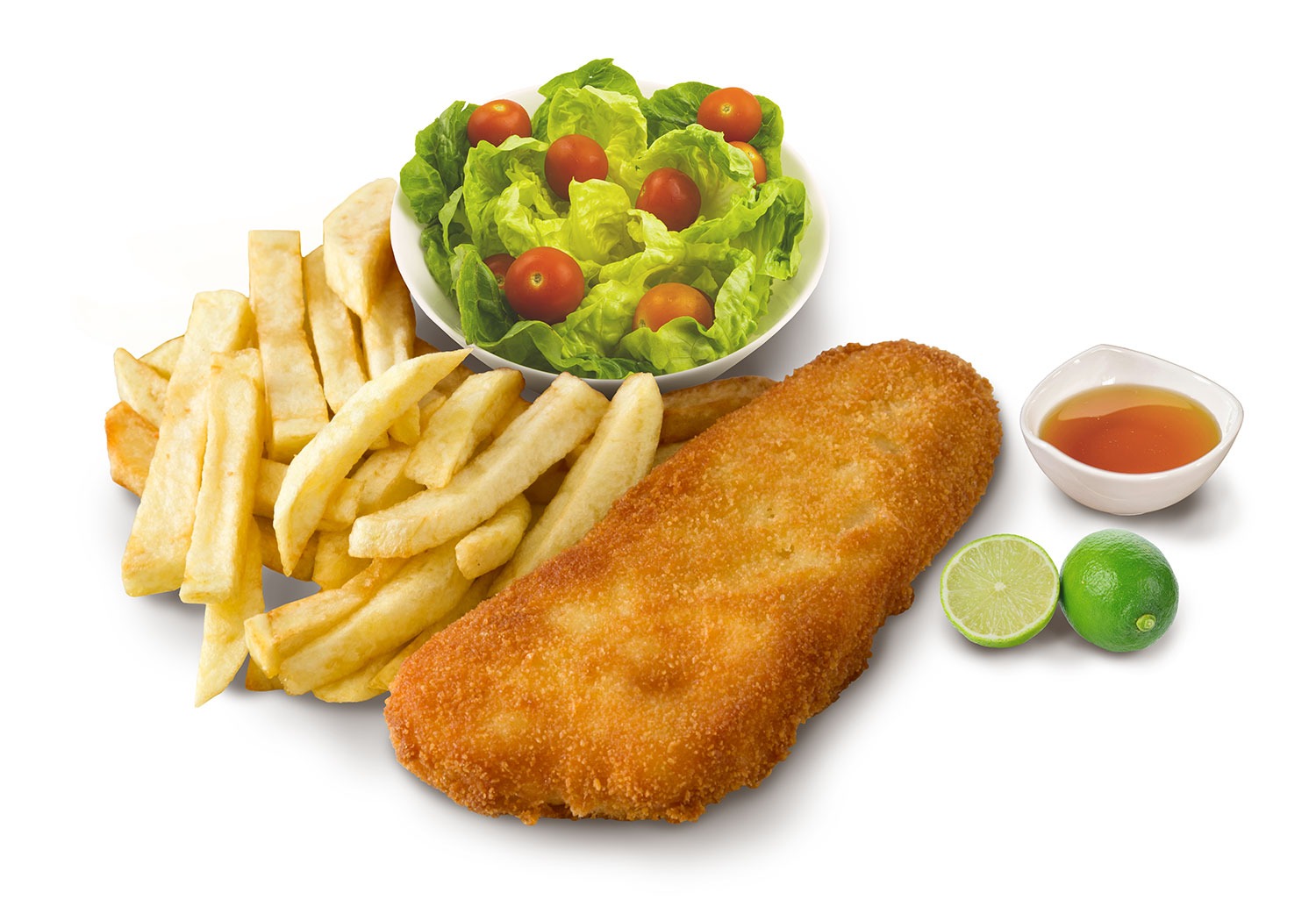 Filete de pechuga apanado en panko acompañando de limón y miel, las inconfundibles papas fritas Rapidogs y una ensalada verde compuesta de lechuga lisa en julianas, tomates cherrys cortados en mitades con vinagreta.