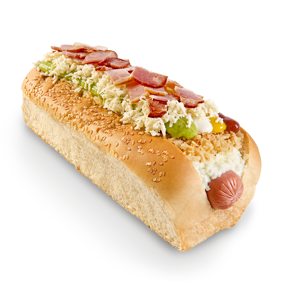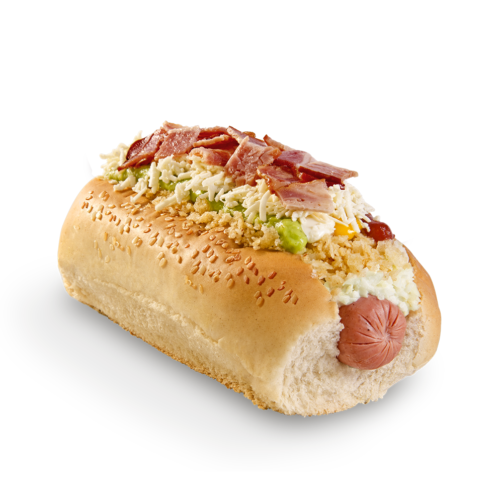 Perro caliente big de 17 cm de ensalada de repollo, ripio de papa, salsas, queso y tocineta.